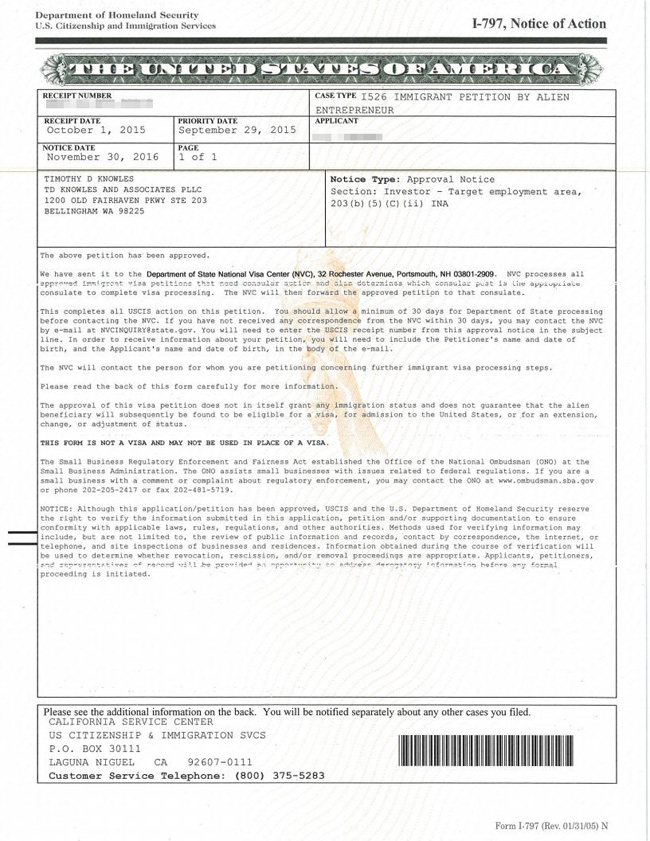 手续。在准备申请材料的过程当中,我司文案团队积极负责,及时与客户沟通。由于准备工作相当完善,提交申请材料之后的13个多月就帮助周总获批了I-526,比移民局的官方审理时间还要短!