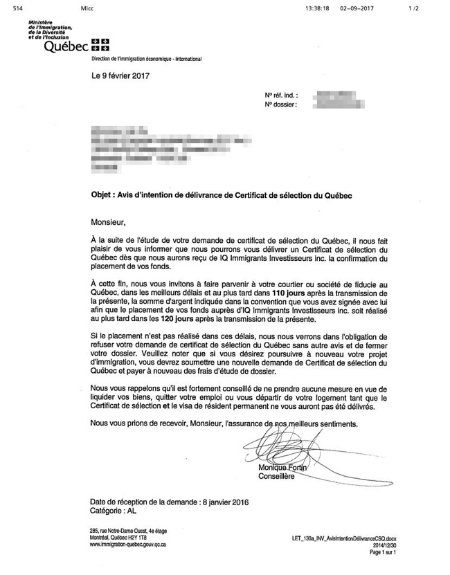 集团再度迎来令人欢欣鼓舞的喜讯!2017年2月13日,我司魁省投资移民客户林先生(化名)接到成功免面试的通知,顺利收到获批信。恭喜恭喜,林先生一波三折的移民之路终于画上圆满的句号。