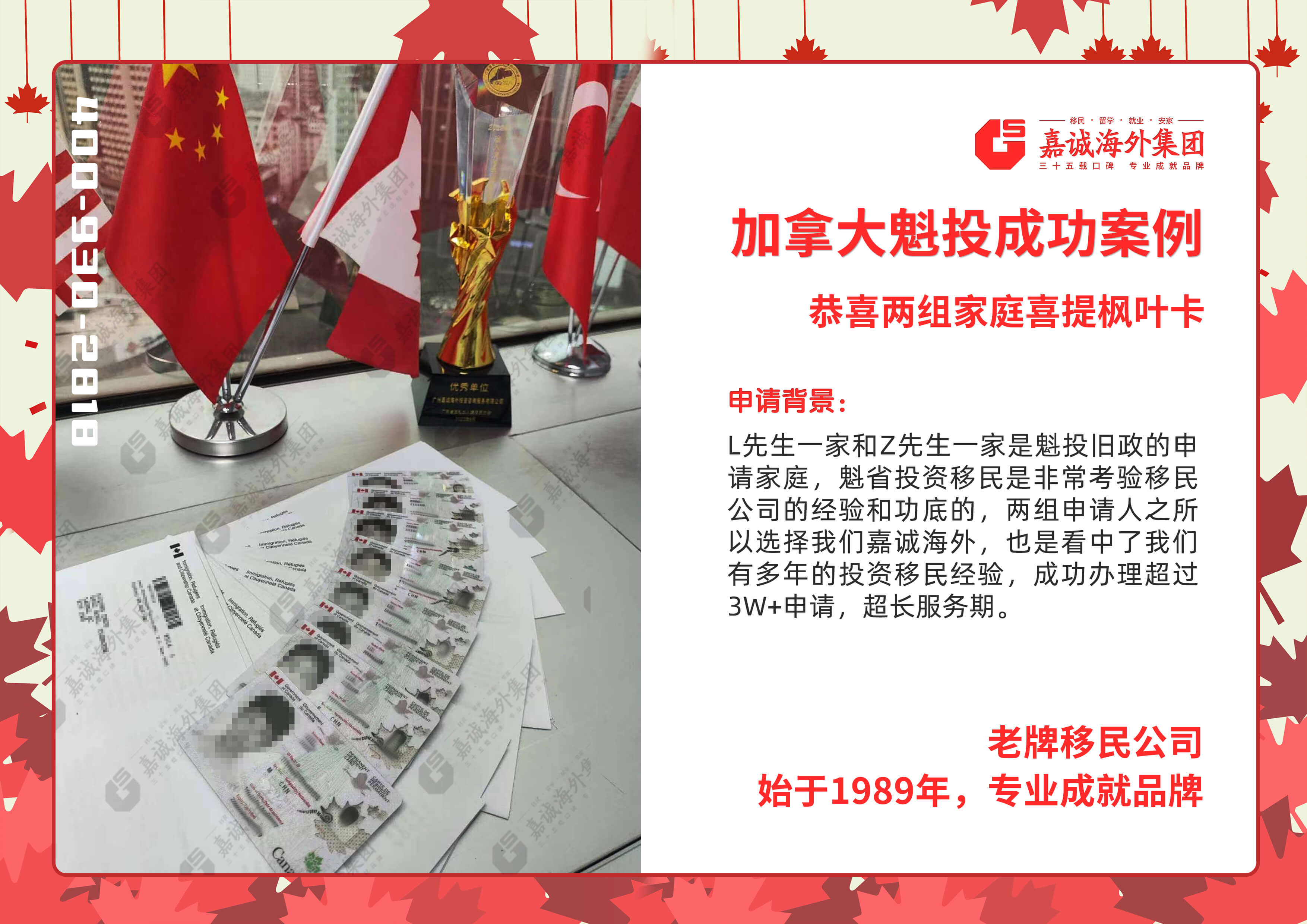 L先生一家和Z先生一家是魁投旧政的申请家庭,魁省投资移民是非常考验移民公司的经验和功底的,两组申请人之所以选择我们嘉城海外,也是看中了我们有多年的投资移民经验,成功办理超过3W+申请,超长服务期。