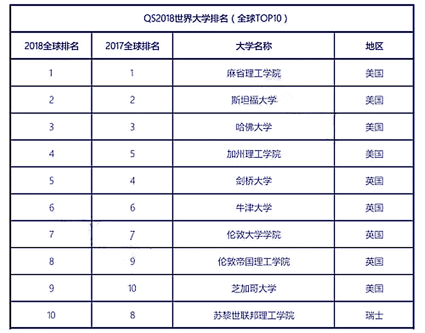 解读:美国大学表现依旧强劲,2018年和2017年QS排名前三名相同,分别是麻省理工、斯坦福大学、哈佛大学。此次,第四名也由美国加州理工摘得,取代了去年剑桥大学的位置。Top10中,芝加哥大学排在第9,在去年排名的基础上前进一位。