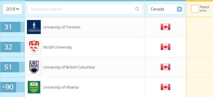 解读:加拿大总计有26所大学被列为世界上最好的大学。其中四所排名全球前100名,另有9所加拿大大学排名前300名。多伦多大学长期保持在加拿大大学中排名第一,麦吉尔大学和UBC位居第二、第三名。