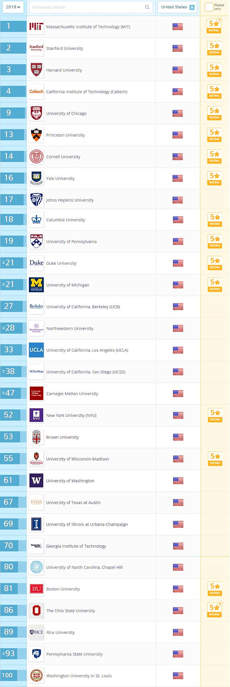 美国大学上榜183所,世界百强大学中有35所美国大学,TOP50中有20所美国大学,由此可见美国大学的实力一直引领世界教育的最前端。