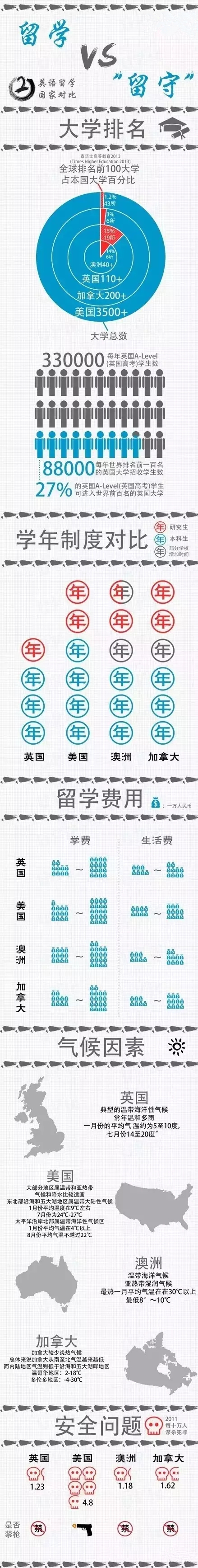 现在是全民留学的年代,而大家的主流留学目的地都为英语语言国家。今天,咱们借用唯一的一张图来看看英语留学国家的区别,还没出国和出国的小伙伴都来看看准不准确,或许还能帮助你做出更好的选择。