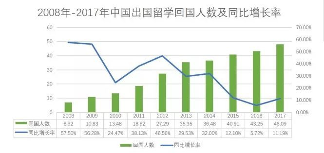 同年留学人员回国人数较上一年增长11.19%,达到48.09万人,其中获得硕博研究生学历及博士后出站人员达到22.74万,同比增长14.90%。2017年度,我国留学生出国学习、回国服务规模双增长,与国家战略、行业需求契合度不断提升,发展态势持续向好。