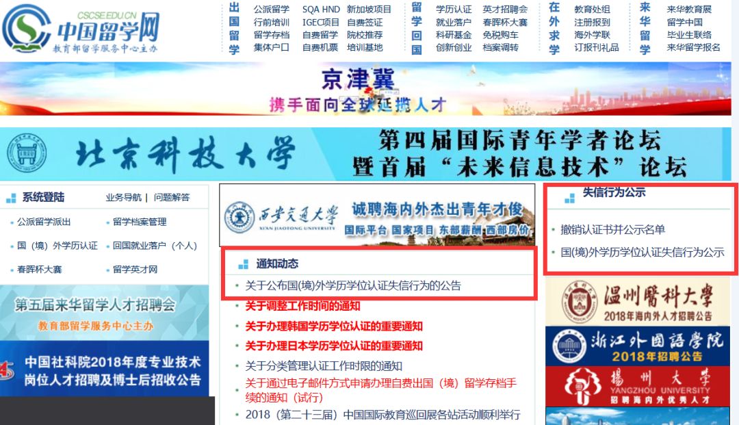 据中国侨网消息,4月8日,中国教育部留学服务中心发布公告称:中心从即日起在中国留学网开设专栏,对国(境)外学历学位认证申请过程中查处的失信行为进行公示。