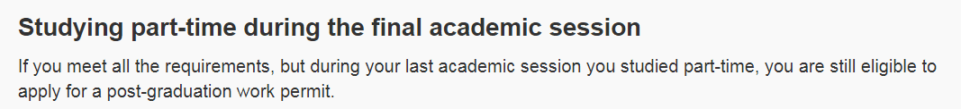 移民局只允许最后一个学期非全职学习。完成学业前的最后一学期,因位课程规划与安排很可能造成只有拿一两门课的情况(study part-time),这样情况下仍可申请PGWP。提前完成项目,就读的项目计划需要八个月或以上,但提早完成者可能符合申请PGWP条件。