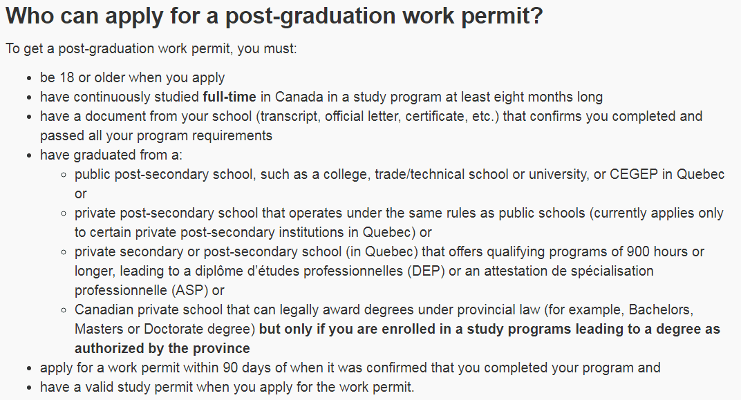 *申请时须满18岁;*必须是全职学生(full-time student)且就读项目长度必须在八个月以上(全职:全职学习的定义则是根据每个学校的规定而不同,但通常是需要注册满3门课,或者9个学分才算是Full-Time。);*经由学校认证已完成项目所有条件(可提供学校成绩单transcript、证书certificate或其他正式证明文件official letter);*毕业于高等教育水平(post-secondary level)课程,或私立专上院校授予的本科(Bachelor's degree)、研究生(Master's degree)和博士生文凭(Doctorate degree);*得到学校的结业认证后90天内提出申请;*申请时持有有效学签。