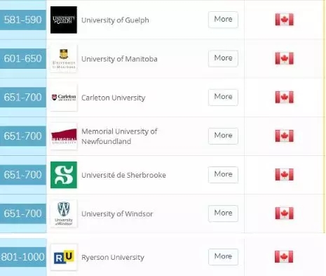 还有阿尔伯塔大学、麦克马斯特大学、蒙特利尔大学和滑铁卢大学四所高校排在100-200区间段。