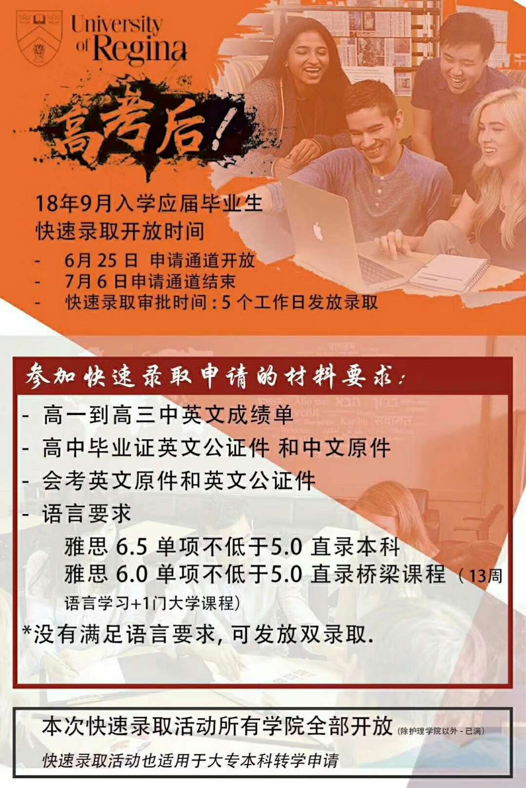 用国际视野考虑升学计划,用相同分数,赢更好未来! 高考后一起来参加加拿大里贾纳大学今秋入学快速录取吧!