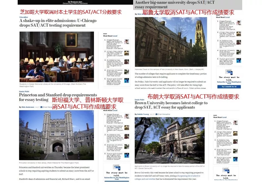 而此前耶鲁大学表示,申请者不再需要提供SAT或者ACT写作分数,哈佛大学和达特茅斯学院也做出了类似的决定。