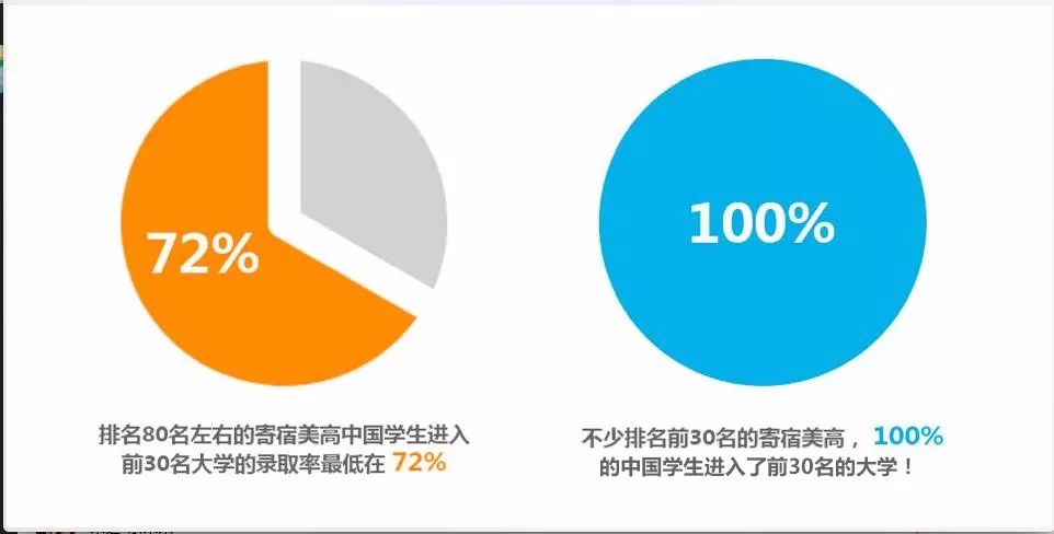 我们统计了40所不同层次的美高录取数据,通过这些数据发现:不少前30名的美高,100%的学生进入了前30名的大学,排名80名左右的学校,最低也有70%的孩子被前30名的大学录取!也就是说:仅从升学率来看,排名80名左右的美高毫不逊色国内最顶尖的国际班的!