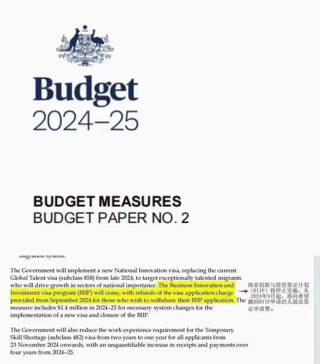 商业创新和投资签证计划(BIIP)将全面关闭,从此退出历史舞台! 从2024年9月起,希望撤回投资移民签证申请的人可申请退还签证申请费 。