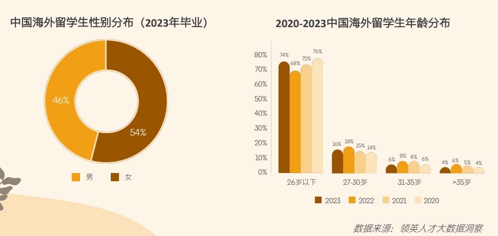 从年龄来看,26岁以下人群占比最高,为76%,且过去四年该年龄段人群占比平均超七成,反映出中国海外留学生群体倾向年轻化。