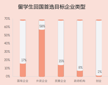 在归国就业的首选目标企业类型方面,外资企业(58%)仍是海归留学生的首选,原因可能是其国际化的工作环境和高薪酬。加之留学生自身具备的优势特点,也使得这些企业更乐于招收留学生。