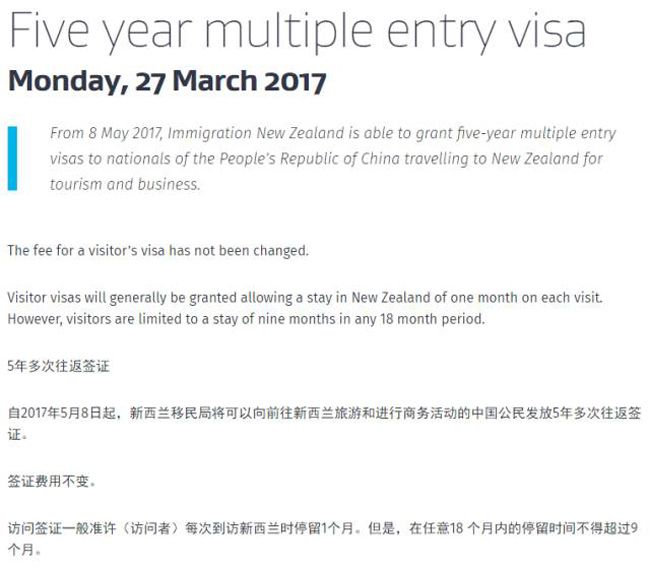 1.自2017年5月8日起,新西兰移民局将可以向前往新西兰旅游和进行商务活动的中国公民发放5年多次往返签证。签证费用不变,与现行标准相同。