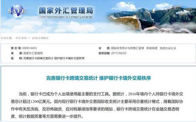 北京时间6月2日,中国外汇局发布《国家外汇管理局关于金融机构报送银行卡境外交易信息的通知》,规定自2017年9月1日起,中国境内发行的各类银行卡,如果在境外消费刷卡超过人民币1000元,发卡行要上报。