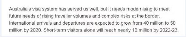 移民局指出澳洲签证系统已经多年没有大变,澳大利亚的入境人数目前每年近4000万,2020年将增长至近5000万。澳洲政府预测,到2023年时,澳洲将迎来超过1000万持临时签证的访客。