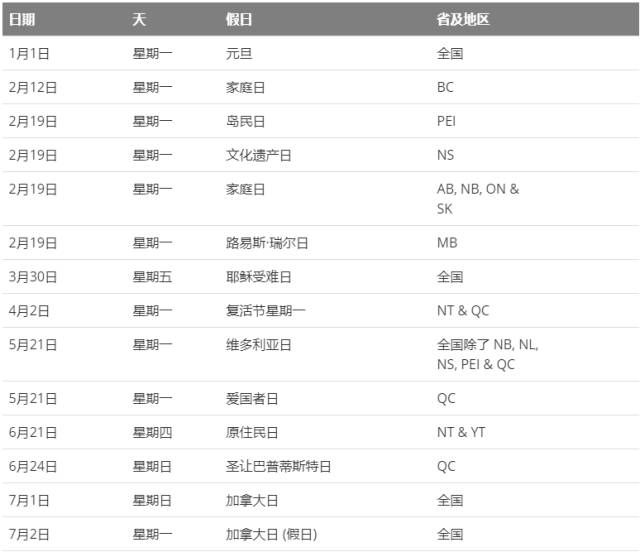 注:①由于加拿大2018年国庆日7月1日是星期日,故将国庆日调整到7月2日举行。②2018年夏令时开始于3月11日星期日,11月4日星期日结束。
