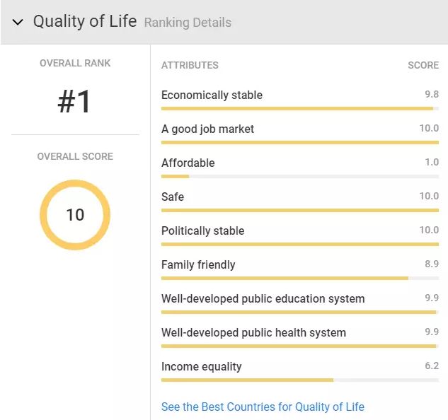 另外,最值得一提的是,加拿大的生活质量超过瑞士,位居世界第一!