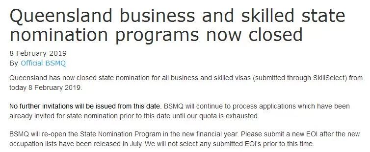 当地时间2月8日,澳大利亚昆士兰州移民局宣布,即日起关闭该州所有商业移民和技术移民的州担保通道,不再接受新的申请。而此前已获得邀请的申请人则不受影响。另外,此次关停之后将会在2019年7月1日的新财年重新启动州担保申请。