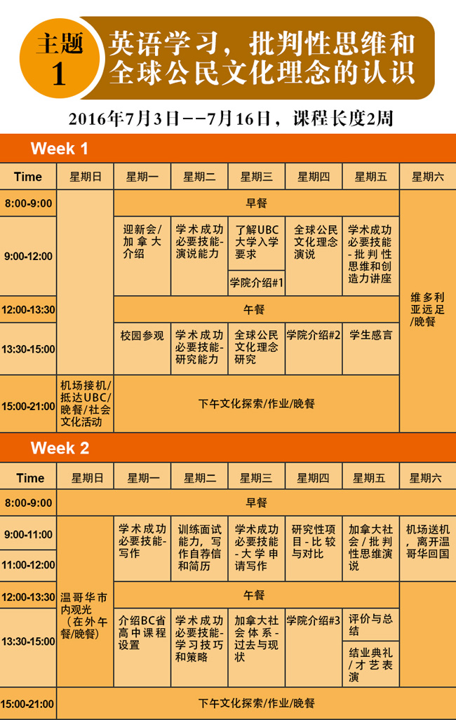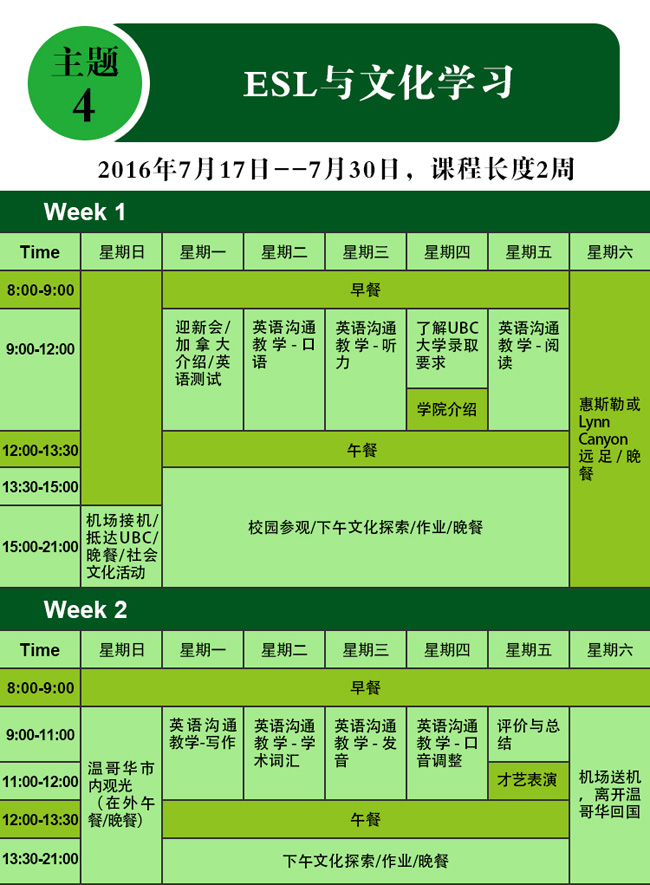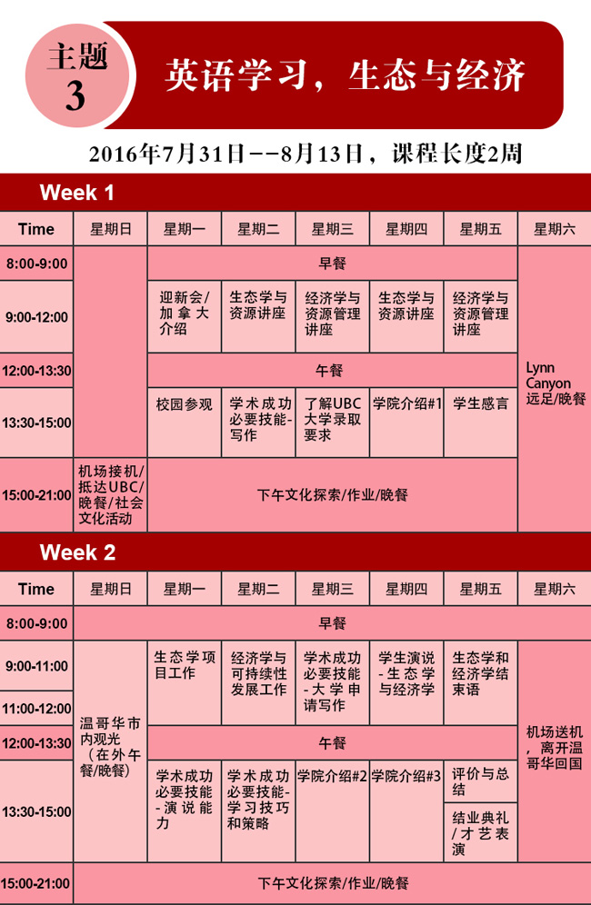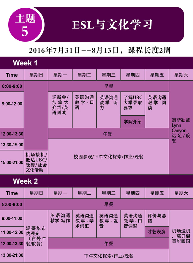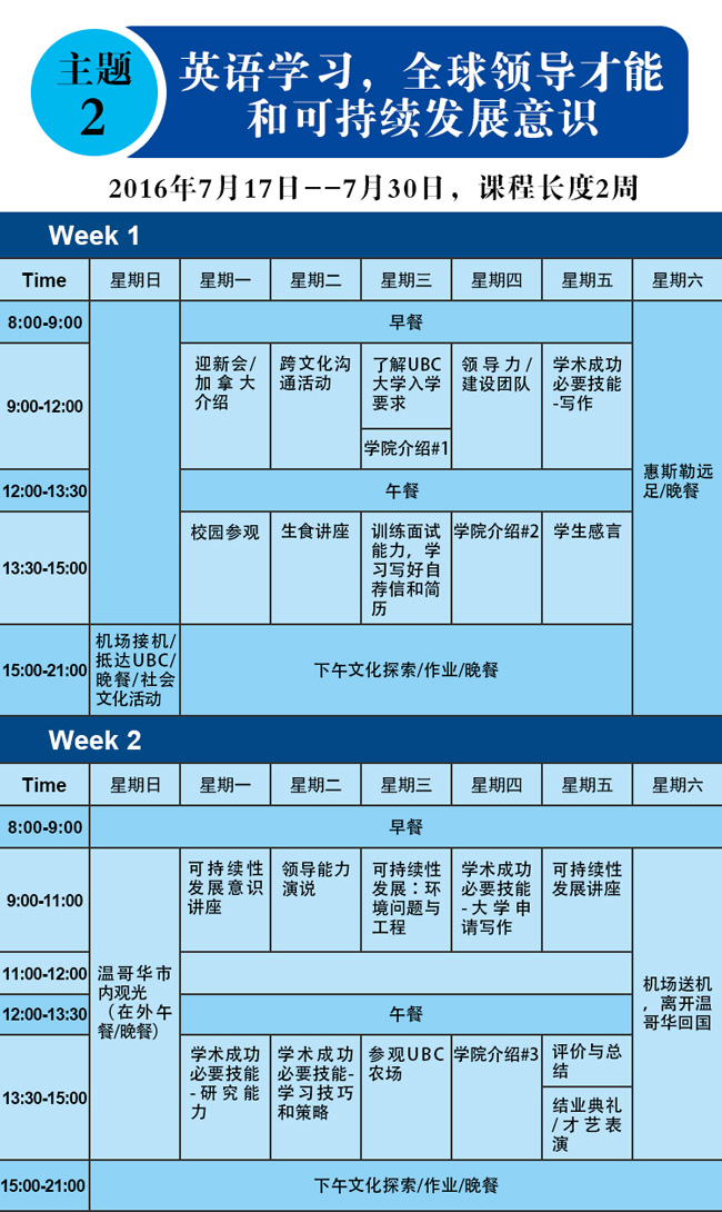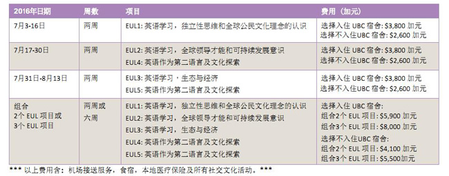 1.EUL1-5任选一个项目,为期2周:选择入住UBC宿舍加币$3,800 ;选择不入住UBC宿舍加币$2,600