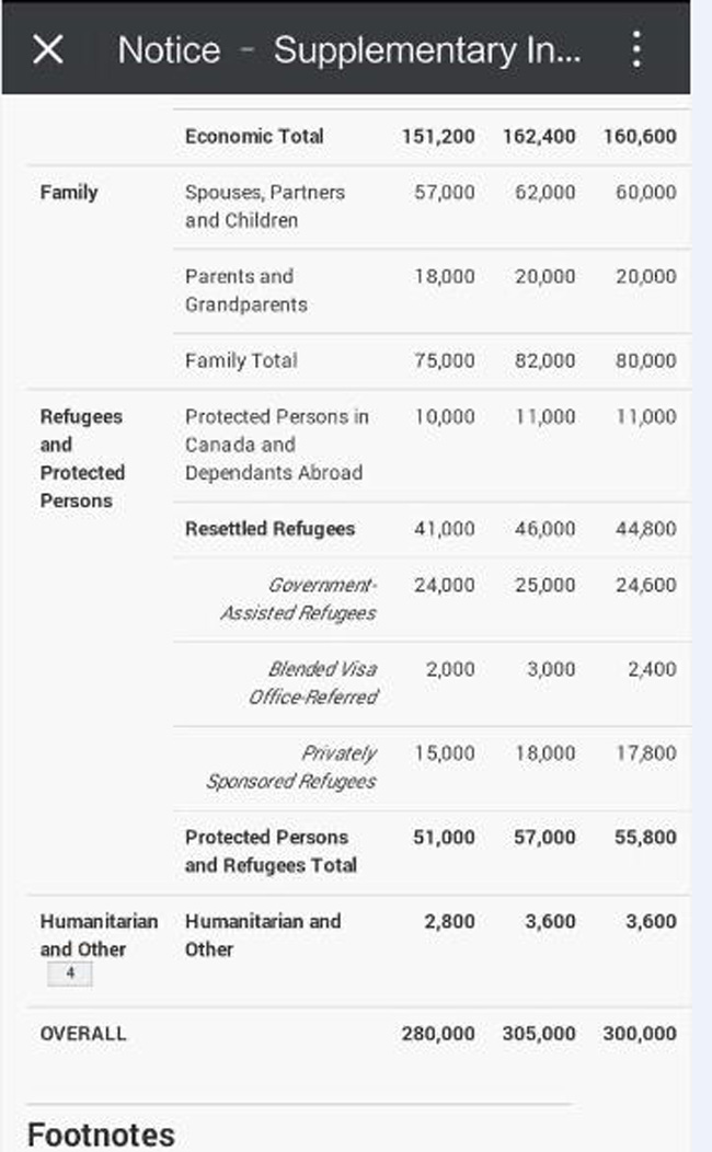 今年家庭团聚的总配额是8万,而家庭团聚类配偶及子女目标是6万,父母和祖父母目标是2万。难民的总配额将近6万人,还没包括人道救援的3600个名额。经济类移民的总配额是15万-16万个,包括联邦、省提名以及魁省移民三大部分。联邦技术移民占5万-6万,而魁省技术移民则占不足3万个。