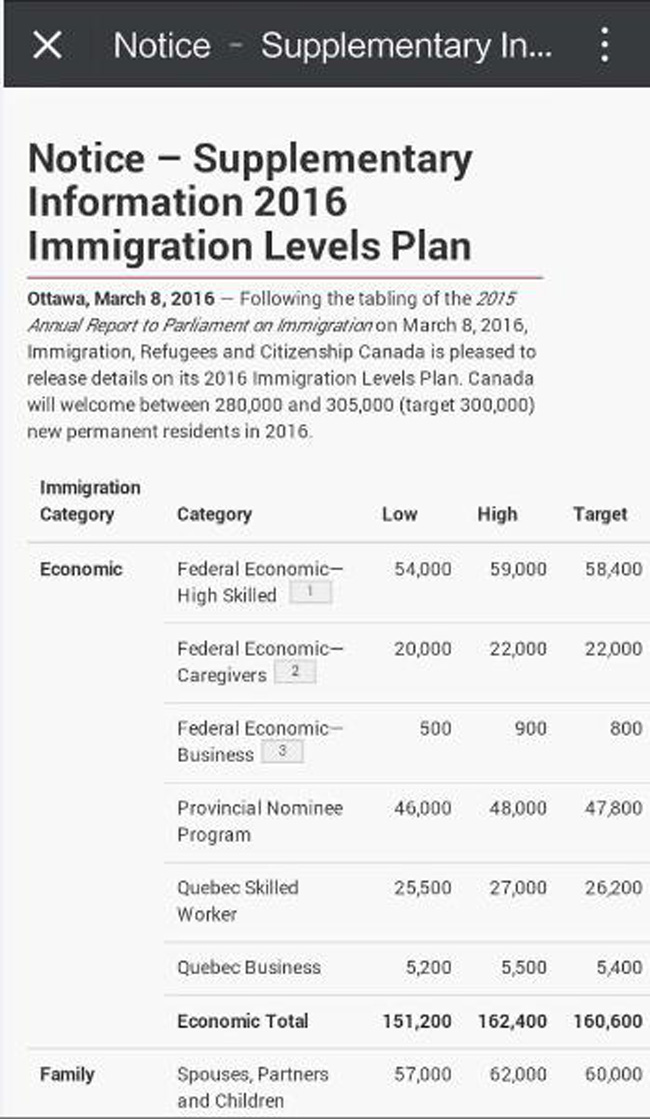 据悉,2014年移民总额是24-26万,2015年则是26-28万。在去年度的移民计划中,经济类占66%、家庭团聚类占24%、难民类仅仅占近10%。但联邦自由党今年已决定大幅增加接收叙利亚难民,加上承诺增加家庭团聚类移民人数,估计家庭团聚和难民这两类别所占的比例,都会有上升。资深移民律师指出,年度移民计划仅是订出接纳移民的上限,就算多出上限,也不会遭到处罚,这完全取决麦家廉的决定。