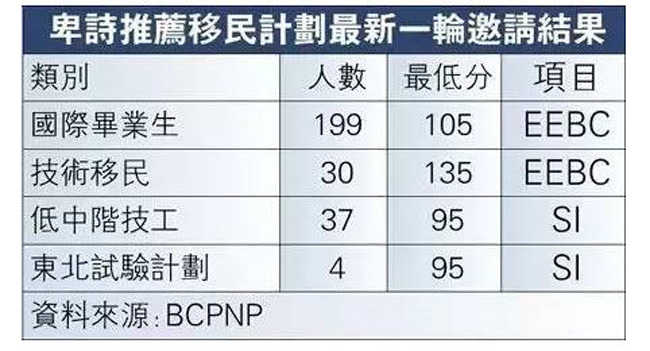 据悉,各类别BCPNP共有270人被抽选。省府亦表示,这是第一次在EEBC类别下邀请国际毕业生申请人。从公布的最新数据来看,国际毕业生共有199人获邀(占总人数的七成),最低分数为105分;EEBC下的技术劳工类别则有30人获邀,最低分为135分;SI-中低技术移民类别有7人获邀,最低分为95分;SI-东北地区飞行员移民类别抽选人数为4人,最低分数则是95分。