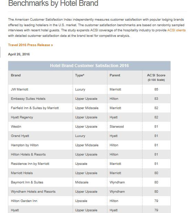 美国分公司收到消息,美国当地公布了截止到2016年4月26日的顾客满意度索引(简称ACSI) 最新成绩。在这份囊括全美连锁酒店住宿品牌的最新榜单中,万豪集团的成绩十分亮眼,旗下酒店在顾客满意度最高的前十名中就占据了5个席位,其余的5席分别为Hilton和Hyatt集团旗下的酒店。值得一提的是,JW万豪酒店更以85分勇夺第一。