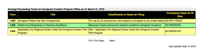 从上面表格来看,截止到3月31日,I-526的审批还未到2014年11月23日之后的递件,而现在的审案时间应该为17个多月;I-829的审批还未到2014年9月20日之后的递件,而现在的审案时间应该为19个多月;I-924的审批还未到2015年6月10日之后的递件,而现在的审案时间应该为10个多月。