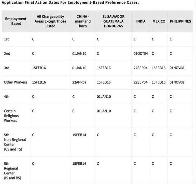 下面一起来看下移民局官网贴出的6月份亲属移民排期表A和职业移民排期表A吧,要提醒的一点是,大部分人只需要留意表格第二列中国大陆出生的申请人的排期。