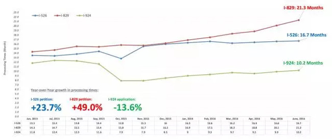 上图显示,在过去一年,I-526审批变缓23.7%,I-829审批变缓49%,而I-924审批加快13.6%!
