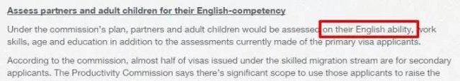 按照委员会的计划,申请人配偶和成年子女的英语能力、工作能力、年龄和教育程度应该被纳入评估标准。据委员会称,几乎一半的技术移民签证发放给了第二申请人,因此这些评估极端重要。