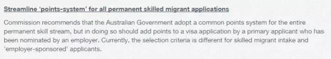 委员会建议,在确定永久性移民项目,甚至包括发放临时居留过渡签证时,要将SOL作为唯一的基准。委员会建议澳洲政府对所有技术移民均采用积分制,并且建议,如果主要申请人有雇主的担保,可以获得额外加分。当前,技术移民和雇主担保移民申请的选择标准有所不同。