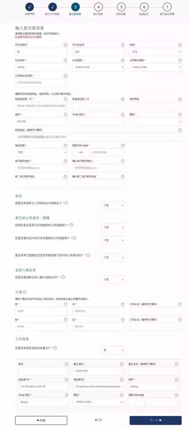 Tips:美国联系人信息可填写目的地或酒店的信息,无联系电话可填“0”