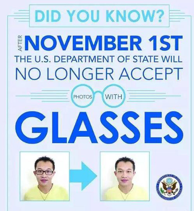 根据美国驻华大使馆的消息,从今天开始,若是想申请赴美签证或者美国护照,申请人将不被允许上交配戴眼镜所拍摄的照片!word天,这似乎对近视的小伙伴们来说太残忍了!