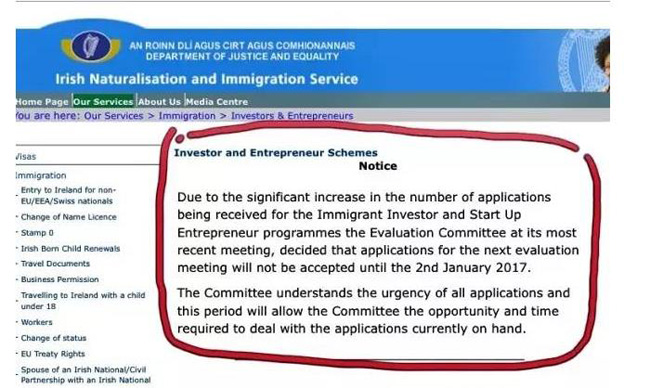由于爱尔兰投资移民和创业移民项目收到大量的申请,评审委员会在近期的会议中做出决定,将不会在2017年1月2日之前接受任何申请。