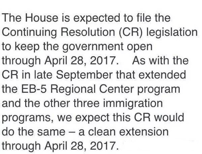 这样说来,好消息是,确定将预算案(CR)延期至明年4月28日,周五前将完成参众两院投票!现有EB-5法律基本确定再次成功搭车,得以一起延期至2017年4月28日!