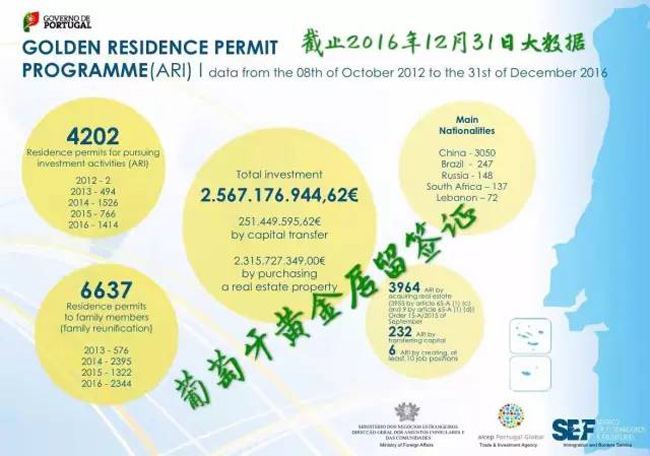 欧洲分公司提供的消息,1月13日,葡萄牙移民局(SEF)官方发布了截止到2016年12月份黄金居留获批的最新数据。数据显示,2016年葡萄牙黄金居留签证共吸引投资达8.74亿欧元,与2015年的4.66亿相比增长了87%!