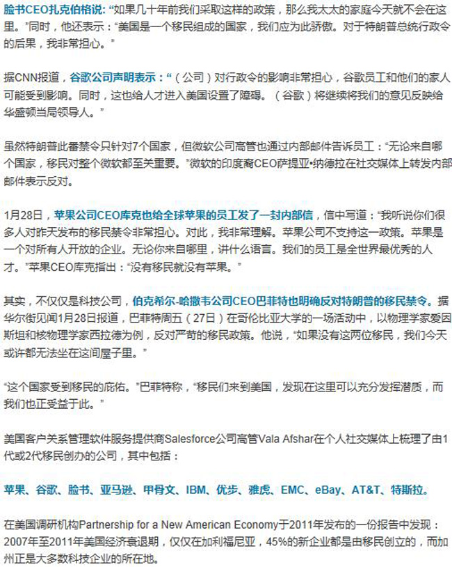 行政令发出后,硅谷最大的几家公司高层纷纷出面表态,反对这项政策。