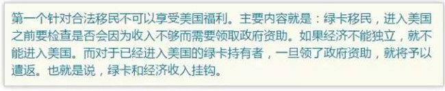 由于特朗普的行政令执行的速度如此之快,就连海关官员和移民局官员都还没有搞清楚,就被迫赶鸭子上架了。在华人圈,甚至流传着特朗普打击合法移民说法,称其将要对领福利的绿卡持有者进行打击,将领过政府救济的绿卡持有者予以遣返。