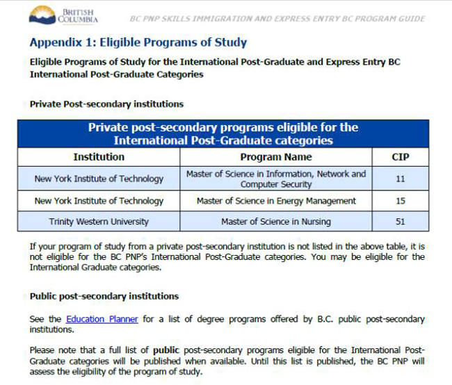 2.BC省提名研究生类别(BCPNP-International Post-Graduate),明确了两所私立大学下共3个硕士课程符合该类别的申请要求。公立学校因符合条件的课程较多,这次的指引里表明将会在准备好之后公布。
