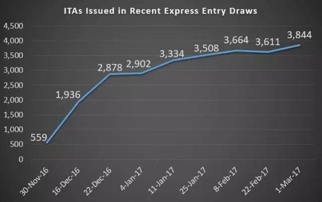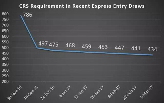 邀约分数:从2016年11月30日开始的邀约情况来看,邀约分数有了“九连跌”,邀约分数分别是786,497,475,468,459,453,447、441和434人。本轮的434分又是加拿大联邦技术移民自从EE新政邀约起的,历史最低分。