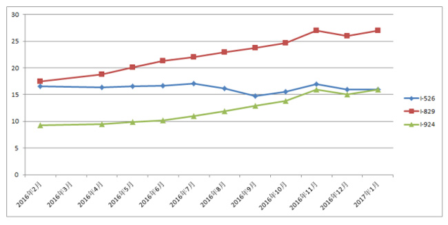 I-526审案前进近一个月、I-829审案倒退几天,令人感到奇怪的是I-924审案前进了一年!业内人士分析,相较于以往的审案速度,恐怕移民局的数据又发布错了,I-924应该是前进到2015年9月18日才对,审案时间应该还是16个月更加靠谱些。