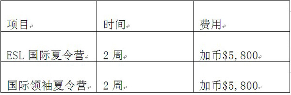 费用包括:机场接送服务(接机和落客在指定时间);医疗保险(保险是从一个学生离开自己的祖国的日期和时间有效,直到在UBC 国际夏令营的最后一天,24小时后);每日膳食(自助式如适用);课本和教学材料;在大学宿舍住宿;免费无线上网;所有的夏令营活动;加拿大英属哥伦比亚大学夏令营T恤和标志;没有多余的或隐藏的费用(除个人消费款项)。人民币付费以当日汇率牌价换算。