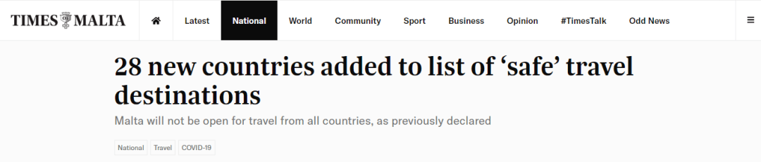 据马耳他时报最新消息,“安全旅行国家”新增28国,其中包括中国。7月15日起,马耳他对中国开放边境,无需隔离和出示任何特殊许可即可入境。