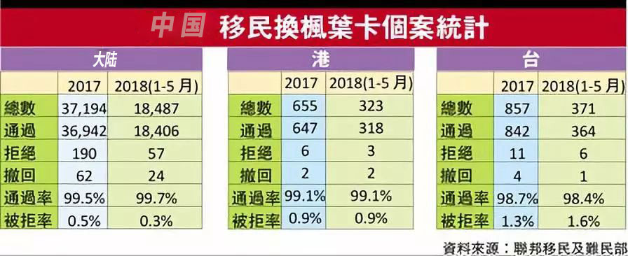 加拿大联邦移民及难民部(IRCC)的最新数据显示,去年有37,194名中国大陆移民申请枫叶卡换发,其中有36,942人获准,有190人被拒绝,有62人撤回申请;故成功率高达99.5%,只有0.5%的人被拒绝。而今年1月至5月,则有18,487名中国大陆移民申请枫叶卡,其中有18,406人获得核准,被拒57人,撤回24人,成功率增加至99.7%,被拒率只有0.3%,等于一千人当中只有3人遭到拒绝。在香港地区移民换发枫叶卡的统计方面,去年有655人申请换发,有647人获得通过,有6人被拒,有2人撤回,通过率为99.1%;今年1至5月,有323人申请换枫叶卡,有318人通过,3人被拒,通过率为99.1%。至于原居地台湾的移民,去年则有857人申请枫叶卡换卡,842人通过,有11人被拒,通过率为98.7%,今年1至5月的通过率则是98.4%。
