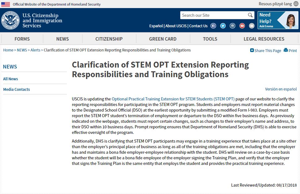 当地时间8月17日, 局发布了一则公告,称其更新了网站上关于STEM专业学生OPT实习期间的一些规定,明确了参与STEM OPT项目的报告义务:(1)如果发生实质性变更,学生和雇主必须尽早向指定的学校官员(DSO)递交修改后的I-983表;(2)如果学生停止与公司的雇佣关系,雇主必须在5个工作日内向DSO报告;(3)如果学生的工作发生某些变更,如雇主和工作地址变更,学生必须在10个工作日内向DSO报告。DHS还明确了,只要符合所有培训要求,且学生和雇主之间为真实的雇佣关系,STEM OPT参与者可以在雇主主要办公场所以外的地点参加培训。而国土安全部将根据每个案件的具体情况,审核签署培训计划的雇主是否是雇佣学生的同一雇主,且雇主确实会提供培训。