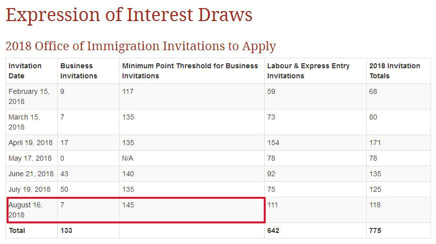 当地时间8月16日,加拿大PEI企业家移民公布了最新EOI筛选结果:最低分为145分(上涨5分),最高分并未公布,7位(减少43人)候选人获得邀请。本次筛选分数创下自今年2月筛选以来的历史新高,这也充分说明了加拿大越来越倾向接收更高质量的移民。所以,趁着现在PEI的政策还比较宽松,建议有意向的投资人加快申请步伐,在政策还允许的时候尽快获得身份。2018年余下的筛选日期暂定如下(或有个别调整):(1)2018年9月20日;(2)2018年10月18日;(3)2018年11月15日;(4)2018年12月20日。