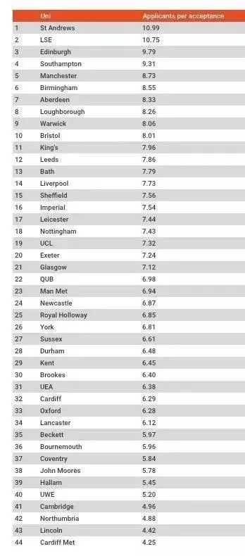 根据2017年UCAS的录取数据,圣安德鲁斯大学St Andrews成为最受学生青睐的英国大学。去年圣安共计划招生1535名本科生,却有将近1.7万人报考,报录比高达11:1。报录比第二高的大学是位于伦敦的金融名校LSE,共有18,225名学生申请,但录取人数仅为1695人,报录比超过10:1。